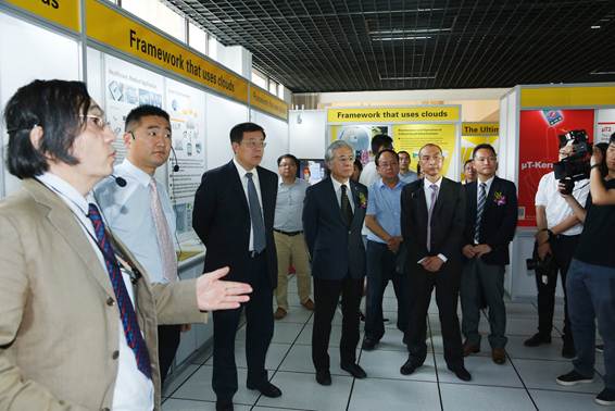 各界嘉賓參觀展區,日方代表石川千秋(左一)現場解說展區。高新區管委尚主任(左三),坂村健教授(右三)、東芝代表廣里暢盛先生(右一)現場參觀。