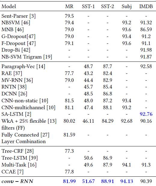 發布時間:2017-07-20 16:25:17 | 來源:機器之心 | 作者:佚名 | 責任編輯:胡俊在 conv-RNN 的基礎上,我們進一步提出了一種新的文本分類模型(如圖 4 所示)。為了驗證該模型的有效性,我們選取了業界常用的 5 個標準的分類數據集:Movie Review(MR);Stanford Sentiment Treebank-1(SST-1);Stanford Sentiment Treebank-2(SST-2);Subj;IMDB。由對比結果可知,conv-RNN 在前 4 個數據集上均超越了各類 state-of-the-art 方法。