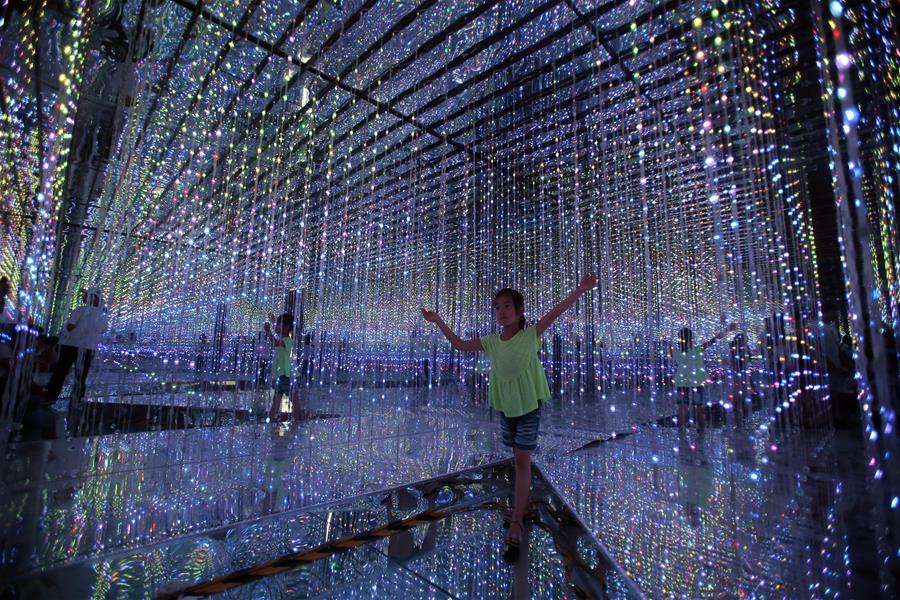 7月22日,小朋友和家長在廈門科技館內體驗光影藝術展。暑假期間,許多小朋友在家長的陪伴下來到廈門科技館參觀學習科學知識、體驗科技魅力。新華社發(曾德猛攝)