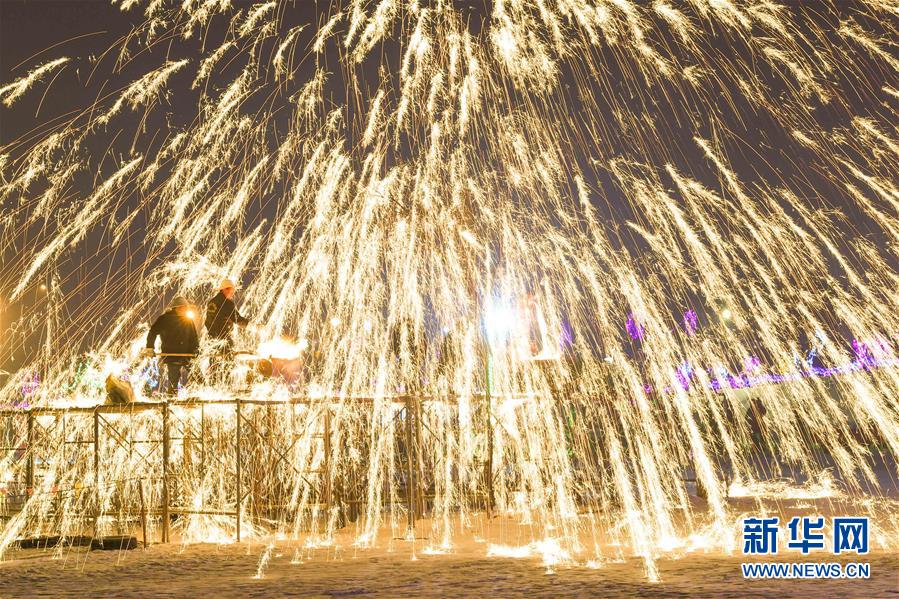 2月18日,民間藝人在內蒙古呼和浩特市賽罕區大黑河首屆冰雪節上表演“打鋼花”,喜迎元宵節。新華社記者彭源攝