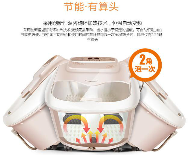 部設有針對人體腳底穴位的按摩凸點,裝有多種適合腳底穴位按摩的組合式串珠,按摩凸點充分刺激腳底穴位,對腳底進行振動按摩,進而消除疲勞,改善睡眠增健康。金剛砂精心燒制的磨腳石,在足浴的同時除去腳底死皮。從足浴盆底部產生氣波,伴隨氣波產生的臭氧溶于水中,氣波和臭氧可以沖擊足底各個部位的穴位,使腳底得到充分的放松,舒經活絡。同時臭氧可以杜絕交叉感染,可以祛除引發腳臭、腳氣的各類真菌、細菌等,臭氧殺菌起到保健、殺菌等作用。外觀設計方面:簡易明了的控制面板,一鍵式啟動;360°旋鈕調節,正反轉操作方便簡易;可翻轉活動蓋板、防濺板于一體的保溫設計,足浴時容器內溫度保持恒溫;盆底萬向滾輪,4個圓形轉輪,即使在裝滿水的狀態下,也可以進行移動。