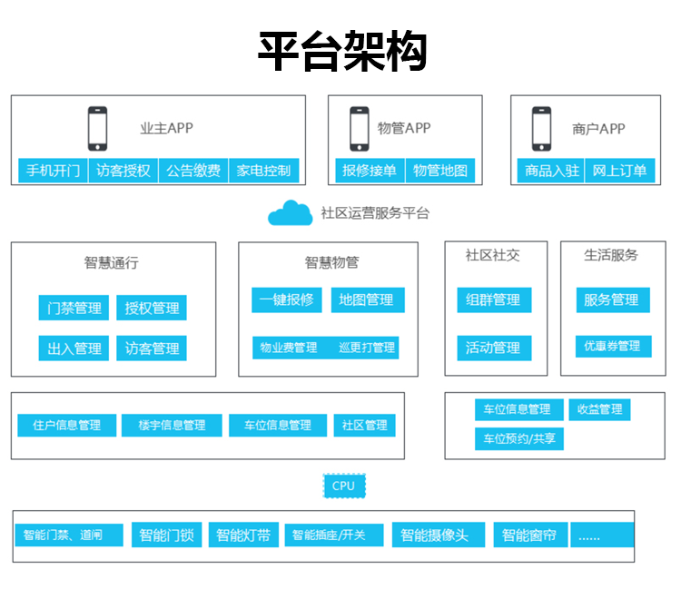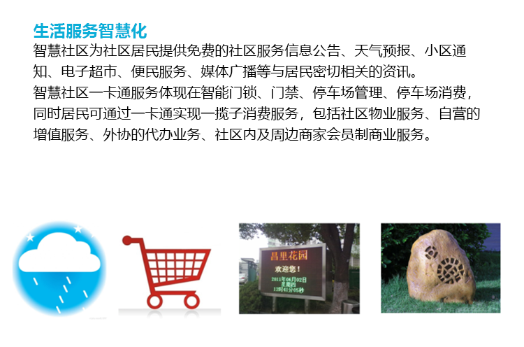 (1)智慧物業管理:針對智慧化社區的特點,集成物業管理的相關系統,例如:停車場管理、閉路監控管理、門禁系統、智能消費、電梯管理、保安巡邏、遠程抄表,自動噴淋等相關社區物業的智能化管理,實現社區各獨立應用子系統的融合,進行集中運營管理。