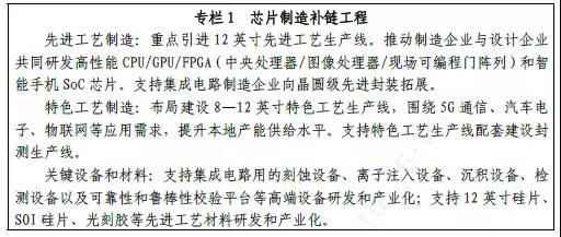 集中突破14納米、10納米及以下節點芯片制造、先進晶圓級封裝、硅光電子制造、高端MEMS(微機電系統)傳感器制造、CPU/GPU/FPGA等高端通用芯片設計、人工智能芯片設計、高端電源管理芯片設計、5G通信中高頻器件設計和制造、EDA/IP核、超高清圖像傳感器制造、高端光刻機和關鍵零部件、GaN外延材料、高純SiC襯底材料、高端功率半導體制造等技術,以及推進面向5G通信、汽車電子、超高清視頻、人工智能等重點領域的關鍵技術研究。