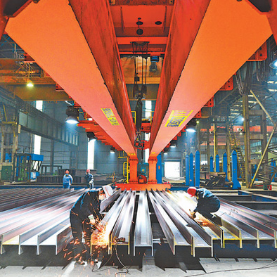 3月31日,安徽馬鋼長材事業部H型鋼生產線成品修磨職工正在對H型鋼產品表面修磨打光。張磊攝(影像中國)