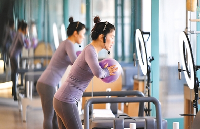 許多熱愛戶外運動的人正“轉戰”室內,“客廳健身”“云健身”成為“宅經濟”的一個增長點。圖為一名普拉提教練用視頻指導學員進行產后恢復訓練。新華社記者劉瀟攝