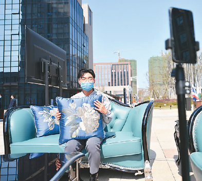 在江西省贛州市南康區跨境電商產業園,銷售員工通過手機直播的形式推銷家具。新華社記者胡晨歡攝