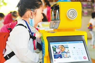 5月13日,安徽蕪湖市繁昌縣城關幼兒園,孩子入園前通過晨檢機器人測量體溫、給雙手消毒。至此,該幼兒園正式開啟了大、中、小班開學復課。楊華攝(人民視覺)