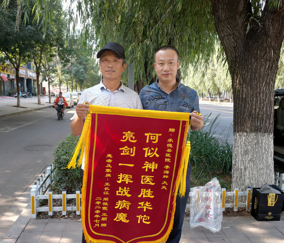 在承德縣中道小區門口,一名男子健步地向李主任走來?!袄钪魅?,還記得我不,謝謝您啊,多虧了您給我做手術,現在我又可以外出打工,又能掙錢養家啦!太感謝您了!”這名男子感激地對李海群主任說道。隨后,將一面寫有“何似神醫勝華佗,亮劍一揮戰病魔”的錦旗遞到了李主任的手上。
