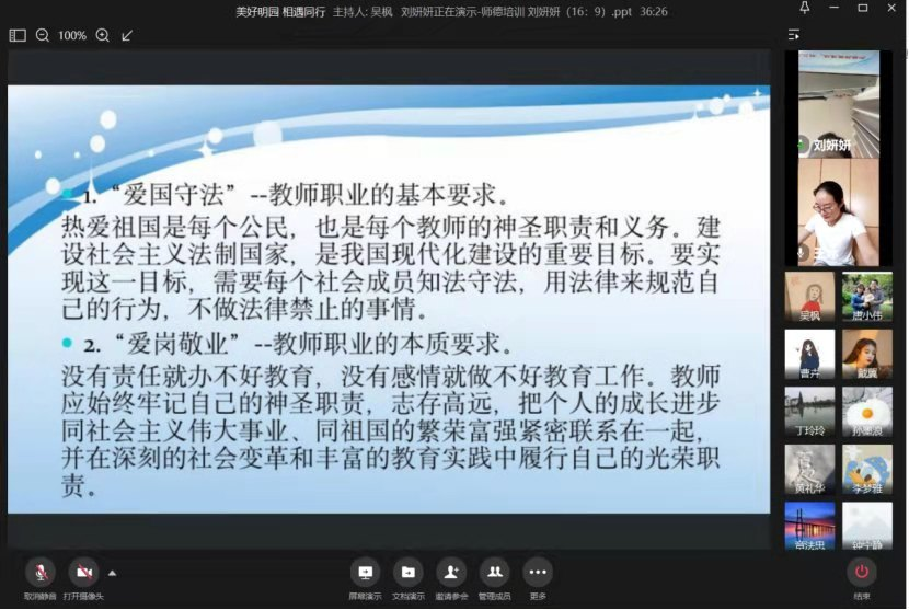 在線上,南京市瑯琊路小學明發濱江分校師德處主任劉妍妍解讀了《中小學教師職業道德規范》,并結合《南京市中小學教師職業行為“三要八不準”》對每位老師提出了具體要求:學高為師,身正為范,教師必須嚴格遵守職業道德規范,在職業生涯中尋求成就感與幸福感?!跋Mw新教師能夠以身作則,嚴于律己,以德潤德,努力成長為一名優秀的人民教師?!眲㈠f。