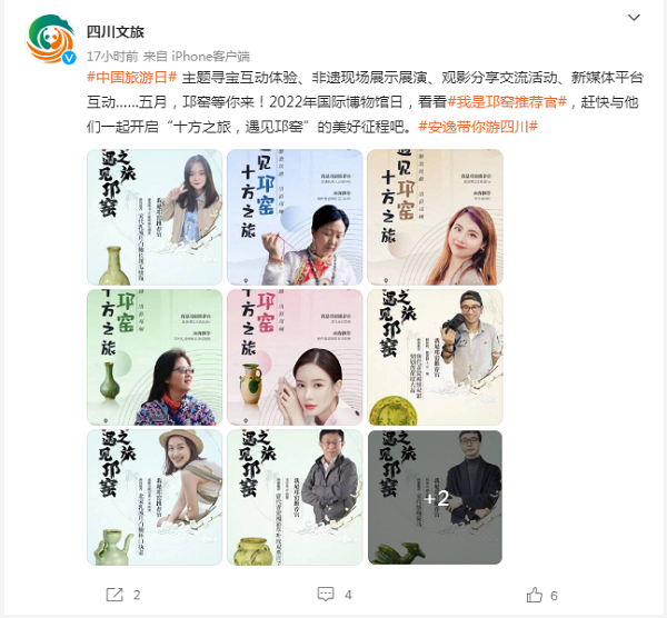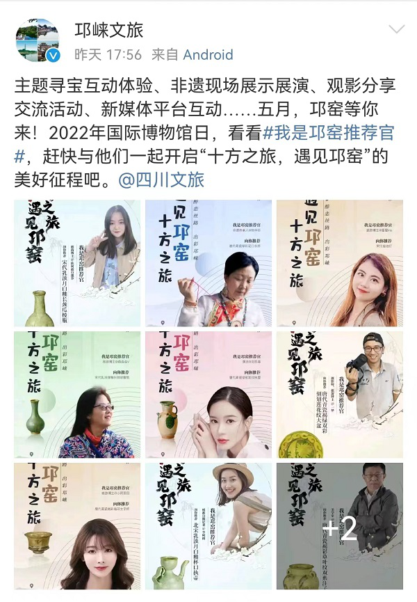 在2022#我是邛窯推薦官#新浪微博打卡活動當中,邀請用戶參與線上打卡,通過推介海報了解邛窯遺藏,一件件精美的文物吸引了許多網友的眼球,紛紛贊嘆邛窯文物的豐富、華美、悠久。截止目前,新浪微博話題#我是邛窯推薦官#閱讀量已超248萬次,評論數超4000人次。5月19日,四川文旅廳新浪官方微博參與播發“我是邛窯推薦官”線上打卡活動,為邛崍文博宣傳點贊加油。