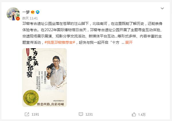 活動期間,首屆“邛窯推薦官”成都日報記者李柯雨、演員劉凱菲、新浪網紅大V“一夢”、作家曹永勝等紛紛發布新浪微博,參與“我是邛窯推薦官”話題打卡活動,傳遞邛窯文博宣傳推介最強音。