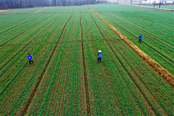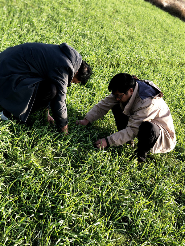 2月7日,農技人員認真查看小麥長勢。寶豐縣委宣傳部供圖