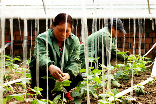 2月7日,農戶在為黃瓜植株進行吊蔓。寶豐縣委宣傳部供圖