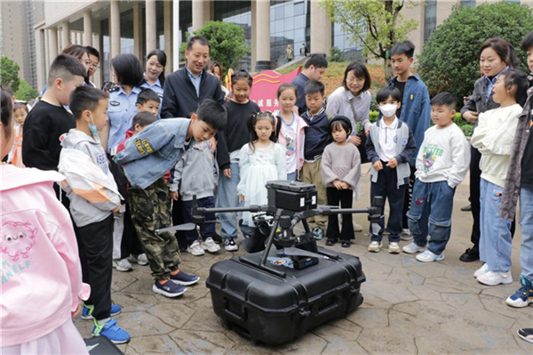 隨后,科技通信化股的民警操控著一架無人機懸浮在人群的上空。三架大小、型號不同的無人機停放在大院空地上,好奇的警寶們立刻奔跑著圍了上去,一邊聽警察叔叔講解無人機的相關知識,一邊看著他操控著無人機展現各種功能。