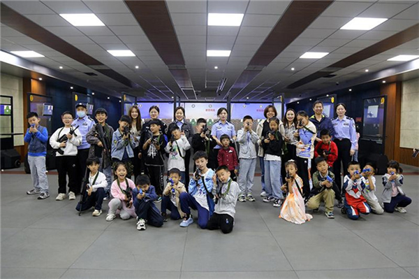 在射擊訓練館參觀,警寶們看見手槍、步槍等槍模,激動的跳了起來。訓練教官向警寶們講解92-G手槍的構造、作用和威力。在現場民警的照看下,警寶們拿著電子槍體驗了一把射擊比賽,擺著各種瞄準、端槍的姿勢拍照,讓一群小槍迷們直呼“過癮”。