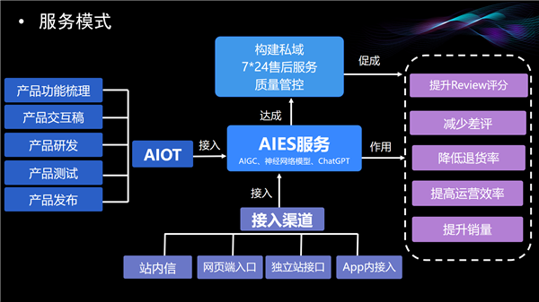 AIES之所以能夠引起業內人士的嘩然,除了能夠最直接地幫助商家降低退貨率、提高利潤之外,很多技術人員關注的是他們的創新思維,比如:首創按退貨率優化效果后置付費的合作模式、全球首創AIES(人工智能進化服務)售后服務系統、將自研領先的AIOT和AIGC雙引擎架構與電商相結合、跨境電商退貨率優化解決方案提供商。