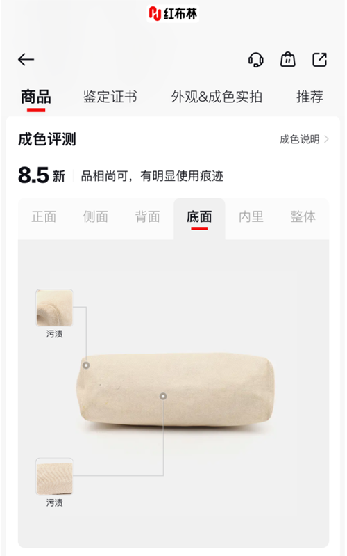 如何讓用戶更清晰、更透明的了解二手奢侈品的成色評測環節?紅布林在行業內首先給出了答案,即把成色評測模塊變成結構化,用戶可以通過結構化的展示,清晰了解到每個瑕疵點的情況,更加直觀地感知到9.9新、9.5新、9.0新、8.5新這些不同商品成色之間的區別,并且能清晰了解瑕疵所在的位置以及具體瑕疵情況。
