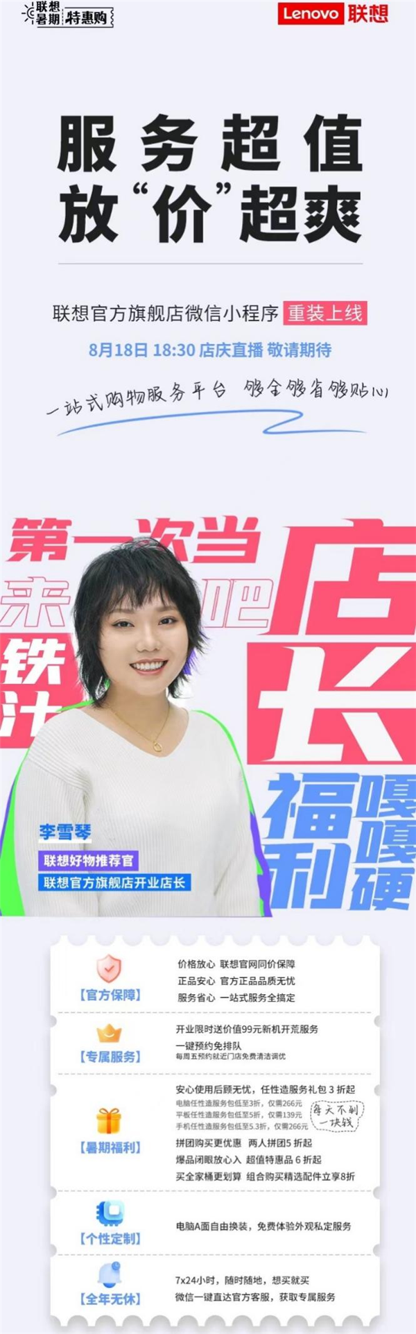 在聯想官方旗艦店微信小程序重裝上線當天,喜劇演員李雪琴作為聯想好物推薦官和聯想官方旗艦店開業店長,也出現在“服務超值,放‘價’超爽”的店慶直播間里,并為消費者帶來了官方保障、專屬服務、暑期福利、個性定制和全年無休這五大驚喜福利。