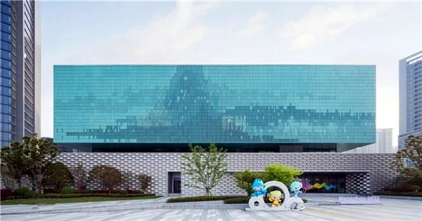 在地處亞運村“C位”的國際區升旗廣場上,幾幢青綠色的建筑讓人眼前一亮,溫潤的質感,淡雅、內斂的外形和周邊挺拔的高層建筑形成了鮮明對比。建筑外立面上,青綠色的“富春山居圖”若隱若現。