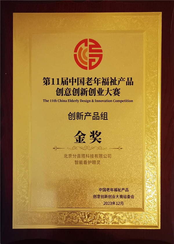 發布時間:2023-12-25 09:52:20 | 來源:中國網 | 作者:辛文 | 責任編輯:趙茜近日,由上海市民政局、上海市科學技術委員會、上海市經濟和信息化委員會、上海市商務委員會、上海市教育委員會聯合舉辦的第十一屆中國老年福祉產品創意創新創業大賽頒獎典禮在上海舉行,在630個參賽產品中,中國首款智能看護精靈榮獲唯一“創新產品金獎”,該產品由北京分音塔科技有限公司自主研發。