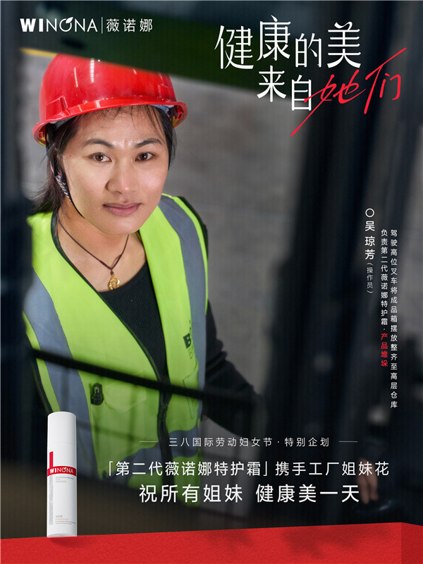 《廠花——新一代中國女工》TVC短片中沒有一位“演員”。薇諾娜以普通勞動者為主角,特邀第二代薇諾娜特護霜生產線上的多位姐妹花出鏡,她們中有檢測第二代薇諾娜特護霜原料達到對應標準放行投入生產的質量檢測員;有駕駛高位叉車將成品箱擺放整齊至高層倉庫的倉管員;有保障產品其成分功效性及安全性的研發員……奮斗在不同工作崗位上的她們,都是第二代薇諾娜特護霜“健康美”的創造者。