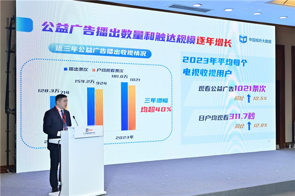 “近三年全國電視和網絡視聽公益廣告播出的數量和觸達量規模都呈逐年增長的趨勢?!睆V電總局廣播電視規劃院副院長滕勇表示,2021—2023年,全國分別播出公益廣告128.3萬,159.2萬,181萬條次,頻率每個收視用戶分別觀看了710次、920次、1021條次,三年內增幅均超40%?!巴瑫r,2023年全國戶均觸達率前三的公益廣告主題分別是生態文明、鄉村振興、反對浪費?!?/p>