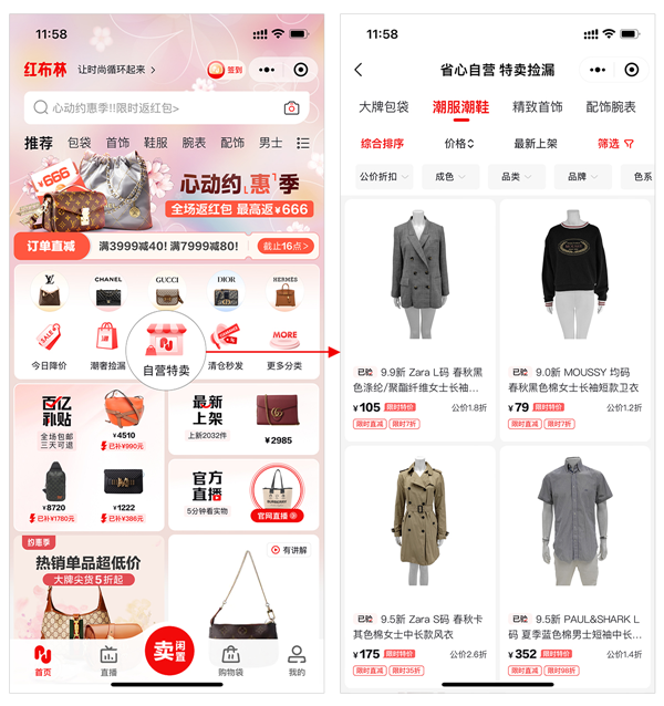 用戶可以方便的在紅布林APP或者小程序找到這些時尚商品,打開紅布林,在首頁中間位置能看到“自營特賣”,點擊進入“省心自營特賣撿漏”頁面,往下滑動,就能看到“潮服潮鞋”專區,點擊后就能瀏覽時尚潮流品牌,進行選購。