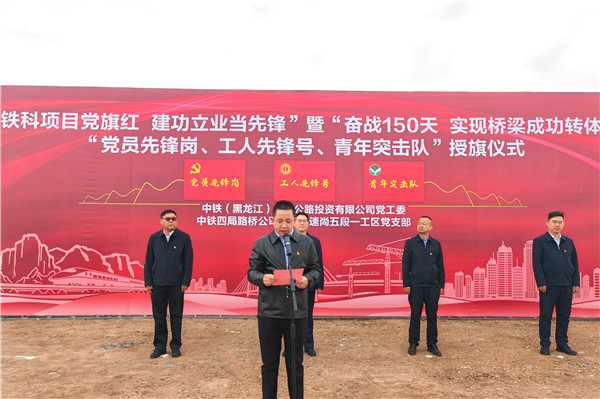 發布時間:2024-04-24 09:43:03 | 來源:中國網 | 作者:陳博 | 責任編輯:趙茜4月23日,中國中鐵鐵科高速公路尚五段PPP項目總經理部在由中鐵四局路橋公司承建的鐵科高速尚五段一工區施工現場隆重舉行舉辦“鐵科項目黨旗紅,建功立業當先鋒”暨“奮戰150天,實現橋梁成功轉體”勞動競賽動員會及授旗儀式。此次勞動競賽的成功啟動,吹響了鐵科高速尚五段施工大干的“沖鋒號”。中鐵投資集團,中鐵(黑龍江)高速公路投資有限公司、中鐵四局路橋公司等單位相關人出席了活動。