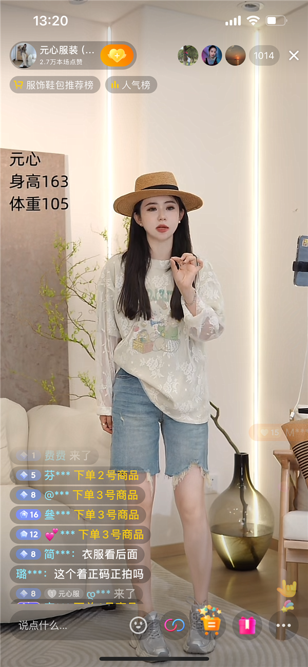 發布時間:2024-05-16 13:44:04 | 來源:中國網 | 作者:梅丹、費敏華 | 責任編輯:趙茜“這件打底,你看可以單穿,完全沒問題,我還要教大家一招,這件夏天還可以當防曬服穿?!痹诤菪绿斓氐囊患遗b直播間工作室,主播元心正對著手機介紹一件打底衫,直播間顯示實時觀眾有1000多人。