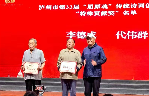 隨后,張立新與市詩詞學會會長尹杰霖向獲得一等獎的22位選手頒發了獲獎證書;尹杰霖也向獲得特殊貢獻獎的代偉群、李德成頒發了獲獎證書。同時,中共瀘州市委宣傳部、市教育和體育局、市文聯、市委市直機關工委、市國資委、市退役軍人事務局(雙擁辦)、市總工會、團市委、市社科聯等部門的領導向獲得優秀組織獎的單位頒發了獎牌。