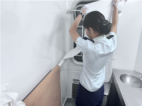 周莉娟立即趕到6號包房查看情況,發現老人正若無其事坐在23號下鋪,詢問其身體是不是有不適?老人說,“我沒事,謝謝!”看著老人對答如流,又看到濕透的床單,周莉娟心中有了答案。通過查看旅客信息,知道老人姓黃,1952年生,上海人,70多歲的老人小便失禁尿在鋪上,對于乘務多年的周莉娟看來很正常。周莉娟詢問老人是否帶了換洗衣物,老人說沒帶,周莉娟便取來一條床單給老人墊在身下讓其休息,并將老人對面的旅客調換到別的包房,然后把尿濕的床單、褥子拿去洗晾,收拾完這些,已經是2時。