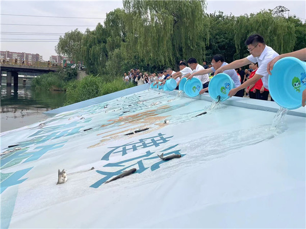 活動開始前在肥城康王河邊舉行放魚環節?!胺鹏~養水”能增加水生生物多樣性,使水生生態系統更加穩定和健康,更有利于構建良好的水域生態環境。
