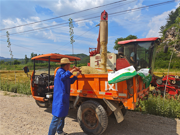 “我家孩子都外出務工去了,就我自己一個人在家,只種了少量的小麥,收割機開不進地里,前幾天我還把手給燙傷了,現在啥也干不了,村上就說他們會組織人來幫我收,我一下子就安心了?!贝迕裢趼斕m坐在地邊樂呵呵地說道。