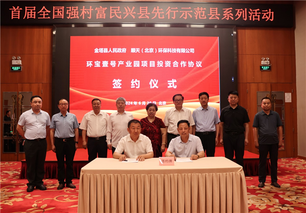 李巖副縣長、甄成君董事長分別代表金塔縣政府和順天(北京)環??萍加邢薰竞炗啞丁碍h寶壹號產業園項目”投資建設合作協議》;陸銘軒主任、李巖副縣長分別代表全國強村富民興縣活動領導小組辦公室和金塔縣人民政府簽訂“共建強村富民興縣先行示范縣戰略合作協議”。