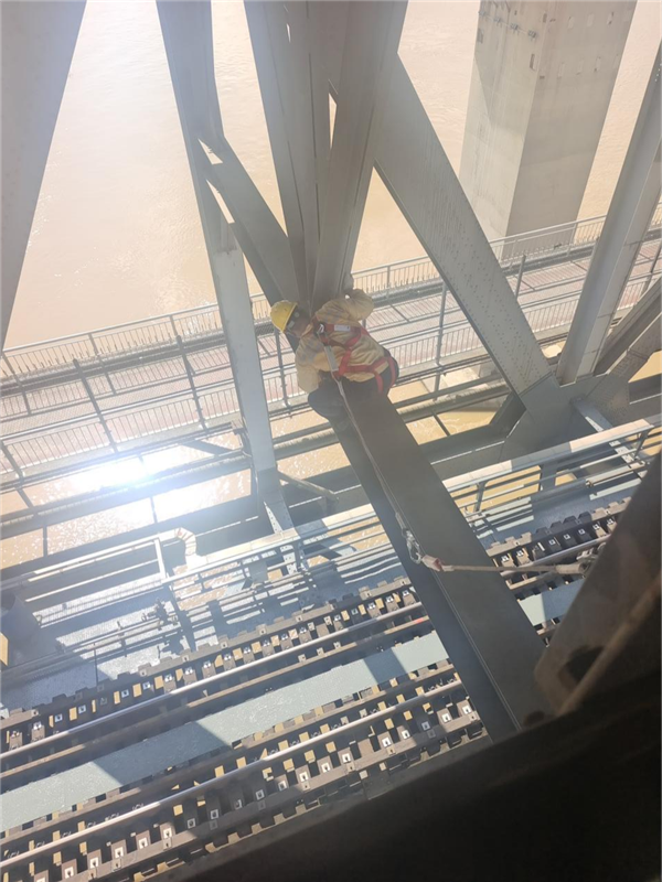 圖為鐵路橋梁工在廣茂線西江特大橋上對鋼梁進行檢查