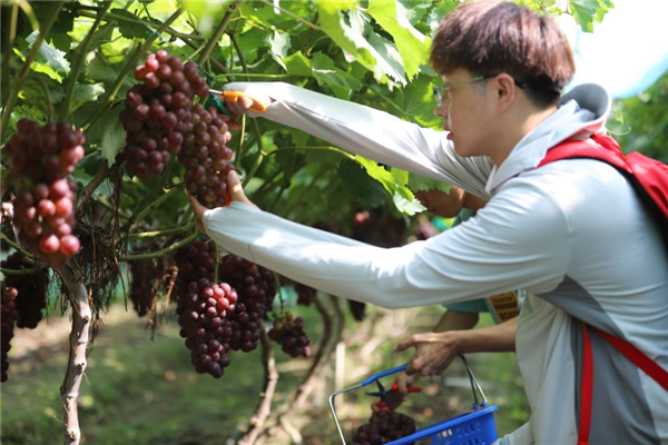 眼下正是葡萄成熟的時節,湖南省益陽市赫山區新市渡鎮跳石葡萄園里,一串串紫紅、碧綠、金黃的葡萄掛滿枝頭,果粒碩大,色澤誘人,吸引游客紛至沓來?!斑@里的葡萄味道很好,摘葡萄也是一種有趣的體驗?!?月12日一早,在該鎮開展暑期實踐活動的大學生倪晨浩就來到葡萄園采摘葡萄,收獲了滿滿一籃子。