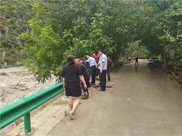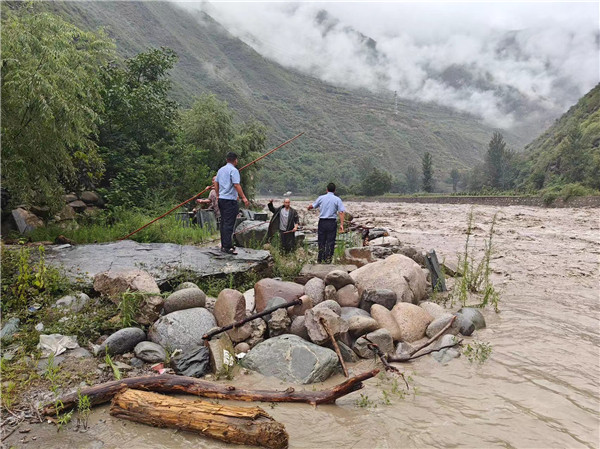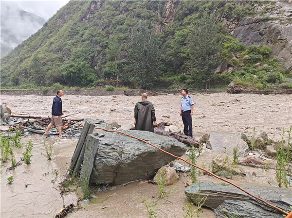 民警到達丹堡河河邊巡查河水水位漲勢,為下一步防洪避洪行動作準備,保障村民的最大安全。