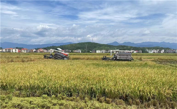 在武岡市鄧元泰鎮山嵐村、灣頭橋鎮石覃村等雙季稻高產示范片基地,金燦燦的稻穗在清風微拂中搖曳生姿,黃澄澄的稻谷顆粒飽滿,洋溢著豐收的喜悅。稻田連片,收割機在稻浪中穿行,隨著撥禾輪飛快轉動,沉甸甸的稻穗被“盡收囊中”,收割、脫粒、碎桿還田一氣呵成,待倉滿再將收割機開至田邊的機耕道,金黃的稻谷通過自動化管道“送”入運糧車,確保糧食顆粒歸倉。同時為下一輪晚稻種植騰地播種,翻耕機、插秧機輪番上陣、有序作業,轉眼間,一株株秧苗被整齊地插入水田里。放眼望去,翠綠秧苗隨風搖曳,寬闊的田間很快又披上了綠裝。