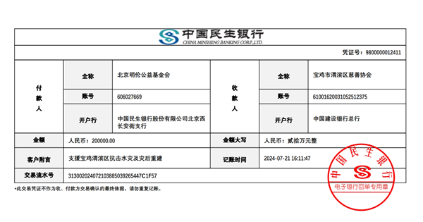 發布時間:2024-07-23 11:22:05 | 來源:中國網 | 作者: | 責任編輯:趙茜北京明倫公益基金會持續關注陜西寶雞水災,得知目前需要救援設備及后勤保障的情況后,基金會決定在前期捐贈救援物資的基礎上,通過民進寶雞市委會再向災區捐贈現金20萬元助力抗汛救災和災后重建。