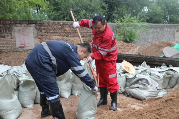董礦分公司黨委書記田?。ㄓ遥┡c辦公室干事黃濤(左)在掘一隊裝沙料