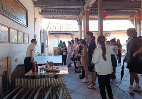 一到曾氏番仔樓,臺籍實習生們立刻被眼前規模宏大、布局嚴謹、風格獨具的番仔樓建筑群所震撼,番仔樓里的各種磚雕、石雕等更是讓他們不由得發出陣陣驚嘆。他們認真聆聽講解員講解東美先輩、新加坡華僑巨富曾振源及其兒子兩代人下南洋打拼的故事,近距離感受哥特式百年閩南大厝建筑群“中西合璧”的極致。