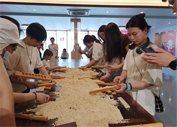 而在佳慶東美糕技藝研習館,臺籍實習生們一邊聆聽講解員現場講解非遺美食東美糕的由來和典故,一邊向東美糕傳統制作技藝傳承人學習如何制作東美糕,學生們親手制作并品嘗,現場一片歡聲笑語。