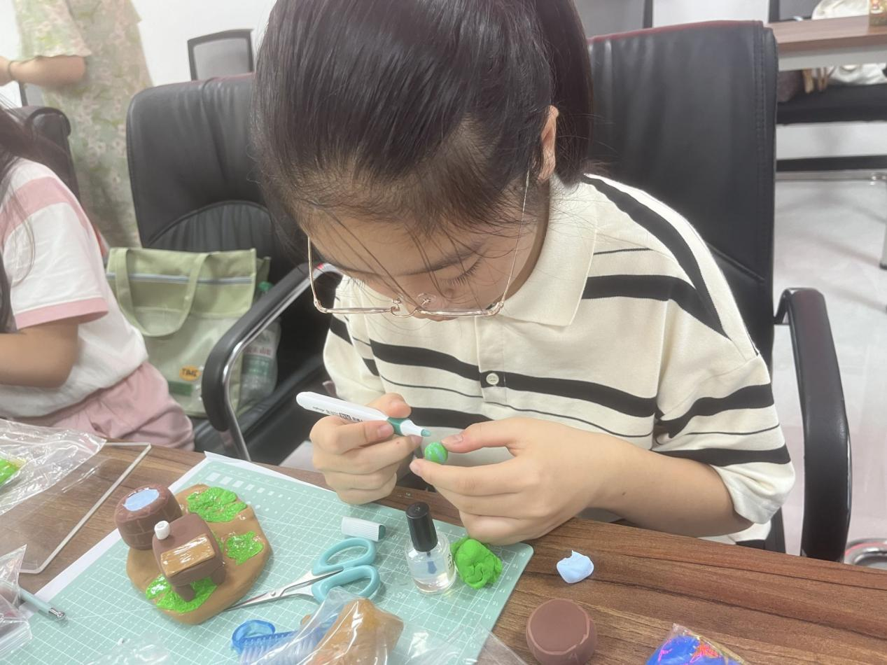 本次活動邀請了專業的手工老師為小朋友們授課,活動現場,手工老師從二十四節氣入手為孩子們介紹并展示了不同節氣的場景泥塑,小巧精致,各具特色。隨后老師開始指導孩子們如何利用黏土的延展性做好底板鋪設工作并通過揉、捏、搓、貼等方式,將粘土塑造成自己想要的造型?!拔乙o小青蛙裝扮一個漂亮的家”、“我想讓小魚兒在蓮葉間戲水”...小朋友們展開了天馬行空的創造力,開始認真制作。隨著孩子們的五指翻飛,一個個充滿童趣的場景作品雛形初見。整個活動現場也充滿了歡聲笑語。