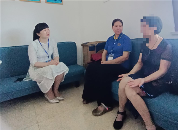 志愿者與當事人(右一)促膝談心 汪令飛 攝