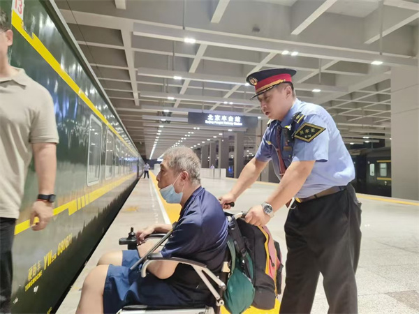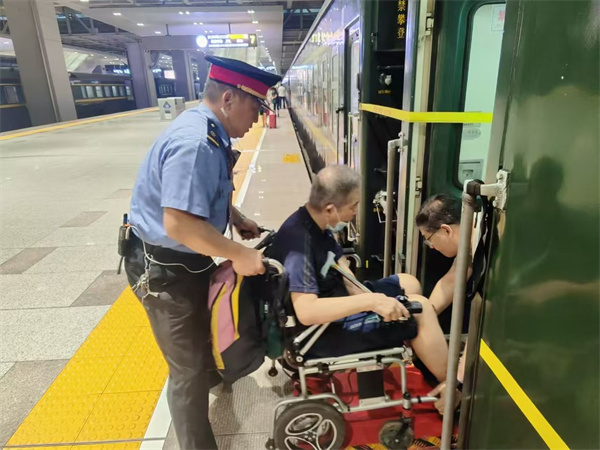 據了解,由鄭州客運段寧波一隊4組,暑運期間擔當套跑的北京豐臺至鄭州的K1305次列車,列車在北京豐臺站始發期間,站臺工作人員將一位乘坐輪椅輔助乘車的老年旅客推向列車,列車長看到后直接從站臺工作人員手上接過這位重點乘客,并在列車員的幫助下,將重點乘客安全攙扶至車廂內。