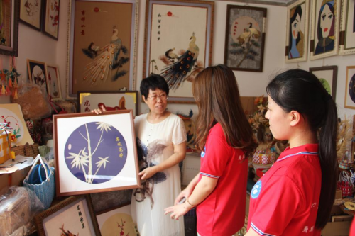 圖為周學玉老師介紹自己的萊州草辮文創產品—草辮畫。