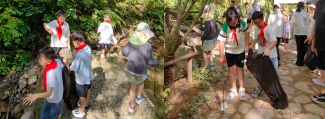一大早,天鐘山景區就熱鬧非凡,童言稚聲不絕于耳。雖然天氣炎熱,但紅領巾們的熱情更為高漲,經過簡單分工后,小朋友們就在景區的小溪邊和山路上開干了,所過之處,垃圾無處遁形。他們頂著驕陽,戴上手套,拿起撿拾器,認真細致地撿拾垃圾,不放過一團紙屑、一塊果皮。迎面走來的游客們,也是小朋友們宣傳環保和垃圾分類的對象,趕上前去熱情地遞上宣傳單,把垃圾分類的知識講解給游客聽。鮮艷的紅領巾映襯在遮天蔽日的綠蔭下,分外耀眼,在小朋友們的不懈努力下,天鐘山景區越發顯得草木蔥蘢、山水并秀,游客們都為這支環保小分隊不怕臟、不怕累、不怕熱的精神,豎起了大拇指!小朋友們紛紛表示,天鐘山代表我們的家鄉,我們要保護環境,愛護家鄉的一山一水,讓家鄉的風景煥發出更加絢麗多彩的活力!