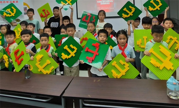 觀影過程中,孩子們全神貫注,時而眉頭緊蹙,時而激憤填胸,深切領會到“落后就會挨打”的道理,以及和平生活之不易的深刻內涵。隨后,活動過渡到寓教于樂的樂高搭建環節。孩子們利用紅色與黃色的樂高積木,著手構建黨徽模型,每件作品都滿載著孩子們對黨的深情厚誼及對美好未來的向往。