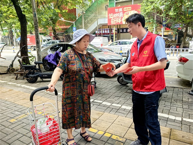 活動現場,青年志愿者們為轄區居民耐心講解政策內容并分發宣傳資料,包括《城鄉最低生活保障》、《特困供養人員生活保障》、《孤兒生活保障》、《臨時救助》、《流浪乞討救助政策》等,并面對面為居民解讀政策措施和救助政策?;顒蝇F場行人紛紛駐足,向青年志愿者們了解政策,提出問題并就生活中遇到的一些困難和志愿者們進行了交流互動、答疑解惑。