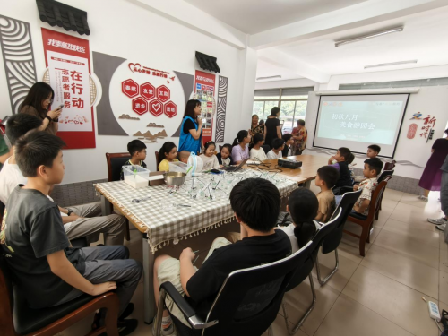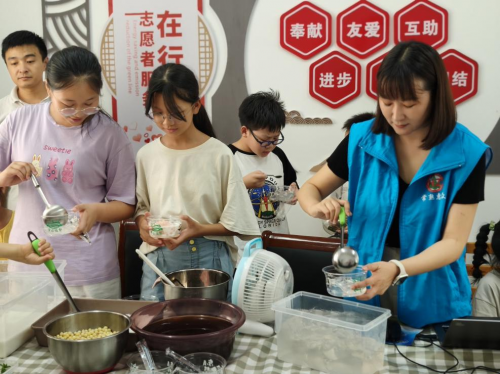 活動開始后,社工先向大家介紹了本次游園會的活動流程,并向大家介紹認識了東青村初秋時分的特產--雞頭米。然后解說了冰粉的制作過程,告訴小朋友們今天準備了紅糖水和薄荷水還有牛奶汁和雞頭米、粉色小湯圓,大家可以根據自己的口味來搭配,自己動手diy一碗心儀的冰粉。